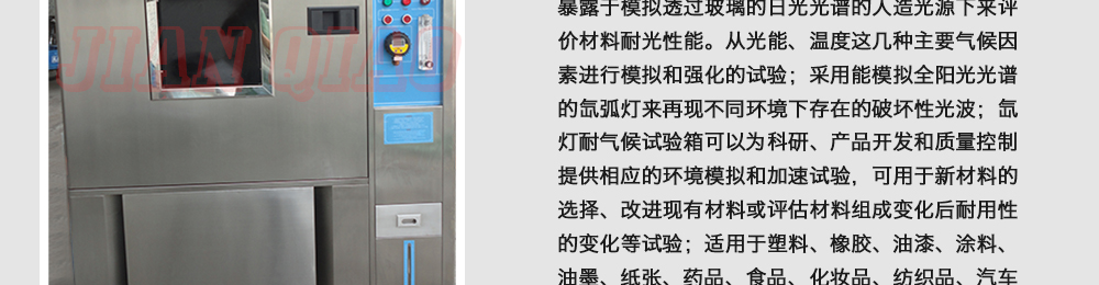 產品型號:JQ-3F-100 品牌:劍 喬 用途:氙燈老化試驗箱,氙燈耐候試驗箱,氙燈光老化試驗機是一種綜合氣候試驗裝置,除進行氣候老化試驗外還可進行高分材料的耐光性的測試,即高分子材料暴露于模擬透過玻璃的日光光譜的咨詢熱線:13829135130