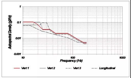 SAE J2380標準振動目標譜基于實際道路測量數(shù)據(jù),旨在模擬行駛10萬英里對電池組和模塊的影響。該標準要求一系列隨機振動目標譜應(yīng)用于三個垂直軸,試驗時長從9分鐘到38小時不等。