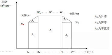 為了簡便起見,往往將功率譜密度曲線圖劃分成若干矩形和三角形,并利用上升斜率(如3dB/oct)和下降斜率(如-6dB/oct)分別算出wa 和w2,然后求各個幾何形狀的面積與面積和,再開方求出加速度總均方根值。